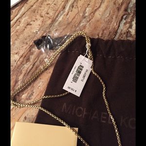 MK logo print gold tone dog tag necklace with toggle closure. The necklace is 21 in, polished finish, crystal detail. Brand new still has the plastic. This includes pouch and booklet. No trades. Price $135.00