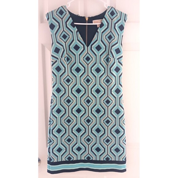 Michael Kors Dress S Sleeveless V-neck Pattern Zipper Geometric Blue Stretch