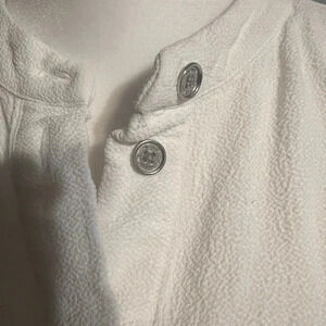 Very flowy fabric. Has some stretch. Could fit small or medium depending on bust size.