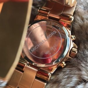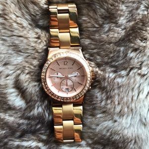 46 clear stones surrounding dial, chronograph function, date display, rose gold case and band.