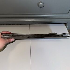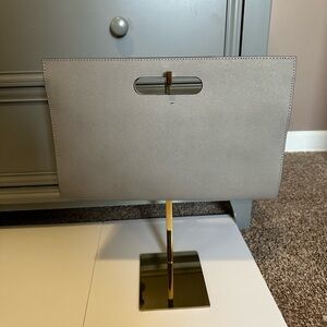 Michael Kors Tilda extra large clutch in gray saffiano leather. Cut out in center to hold with magnetic snap closures. Silver hardware with gray logo fabric interior with 6 card slots, inner zip closure pocket, and slip pocket. Loops on side to add strap or chain. Excellent used condition with 2 very minor marks on leather pointed out in pictures. Interior is pristine. Approx 13” X 8.5”.