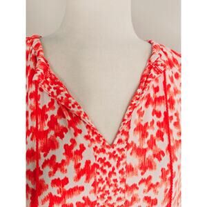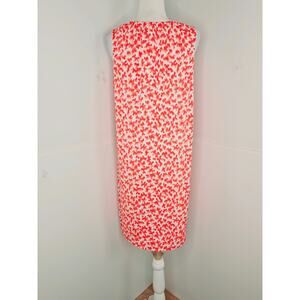Sleeveless shirt dress in "bright ruby red" & white print or it can be called bright red coral. Gathered split front neckline. Bright Ruby colored twist-braided strings at front with large adjustable tasseled ends. Loose flowing fit with lots of stretch. Pullover style. Unlined. Straight hem. Shift dress. The color looks the most like the 5th pic.