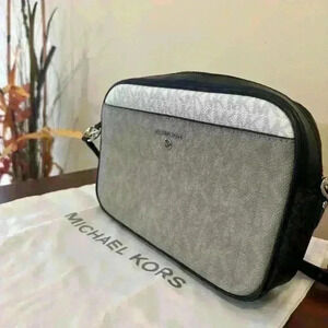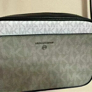 Textured finish on outside with silver hardware. Gray, lighter gray, and black. The Kors logo shows through the textured finish. Has two outer large pockets. The inside has a pocket as well as credit card slots. This bag can hold a lot! Really nice bag.