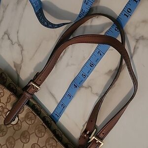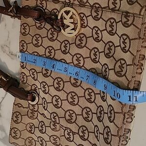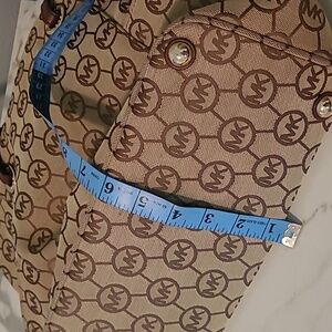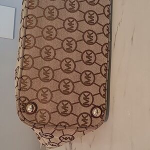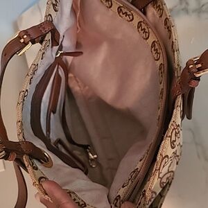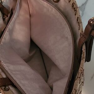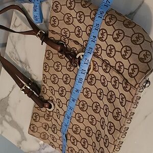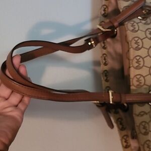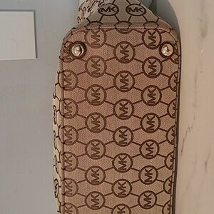 Michael Kors East West Monogram Travel Tote Bag Tan Brown Gold Hardware CarryAll