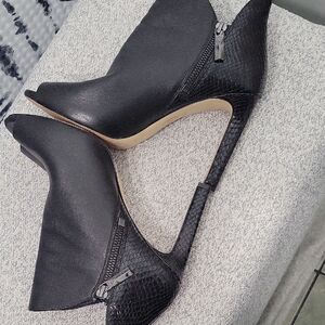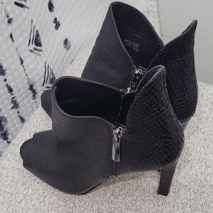 Step out in style with these chic black peep-toe ankle boots. Perfect for any occasion, these boots offer a sleek and sophisticated look.used good condition