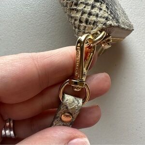 A Michael Kors wristlet styled in embossed leather. This Michael Kors wristlet features a zip-around closure; fully lined interior, three credit card slots, center id slot and single slip pocket. Dimensions shown in photos.