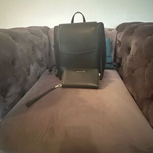 Michael Kors Bag Emilia Belted Backpack Black Leather Medium $428 B2E new with out tags with a matching wallet.