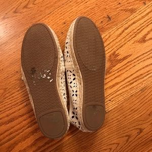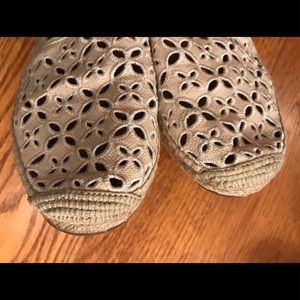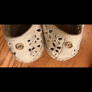 These Michael Kors espadrille loafers have a canvas upper, slip-on style, round toe, cut out design. There is a branded insole and MK initials at the heel back all sitting on a rubber outsole. EUC, noting wear on the jute insole. Size 7 #petfree #smokefree