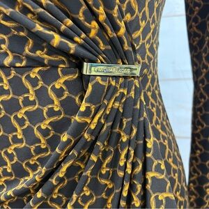 Michael Kors Espresso Chain Link Print Stretch Jersey Faux Wrap Dress. Gives major Y2K Carrie Bradshaw SATC vibes. Classic chain link design long sleeved dress. Gathered at side waist, Very flattering! Dark espresso in color with goldish chain link pattern. Gold colored buckle at where dress gathers. Polyester/ spandex blend - gives a lot of stretch to fabric. Great condition.