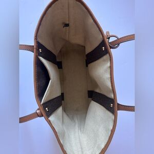 The Eva tote bag is a versatile, seasonless style that's all about understated luxury. Defined by the Signature Michael Kors print with contrasting center stripes and leather trim, this carryall has a spacious interior designed to stow a laptop plus other essentials for a busy day or long-haul flight. Clutch included.