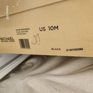 Michael Kors Evaline Almond Toe High Heel Booties Black / Signature Size 10. NIB. Original box/packaging. No rips/stains/scuffs/tears or peeling. Some tag residue on the bottom of one boot. Box has minor damage. Smoke free home. No odors. All offers are welcome. Thank you!