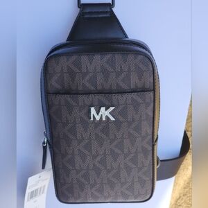 Michael Kors Everett Brown Canvas Leather Adjustable Strap Unisex Sling Bag