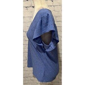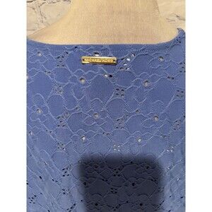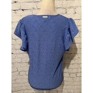 This Michael Kors Eyelet Lace Ruffle Short Sleeve Blue Women's V Neck Floral Blouse is a stylish and versatile piece perfect for various occasions. Made from a blend of polyester and spandex, this blouse features a flattering V-neckline, short flutter sleeves, and intricate lace detailing with ruffle accents. The blue floral pattern adds a touch of femininity, making it a great choice for spring, summer, or fall. This pullover blouse is designed for regular sizing, making it a comfortable and chic addition to any woman's wardrobe. 20 inches pit to pit and 23 inches long. Smoke free home.
