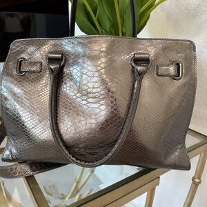 This is a Michael Kors metallic snakeskin-embossed leather satchel tote.