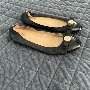 Michael Kors Flats Women 7 Shoes Black Round Cap Toe Leather Bow Gold Ballet
