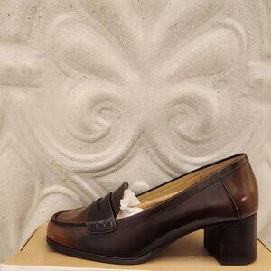 Penny loafer tailored pump set on a comfortable stacked heel, epitomizing style and sensibility giving everything from denim to dresses an element of heritage-chic.