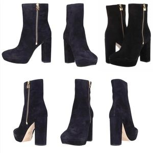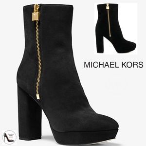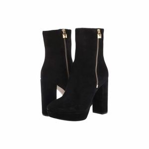 Michael Kors Frenchie Black Suede Stiletto Block Heel Platform Logo Ankle Bootie