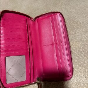 Elegant fuchsia leather wallet by Michael Kors. Features sleek design and gold-tone logo. Ideal for daily use.