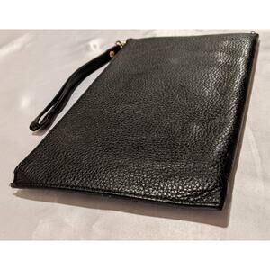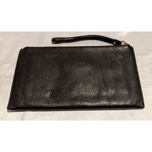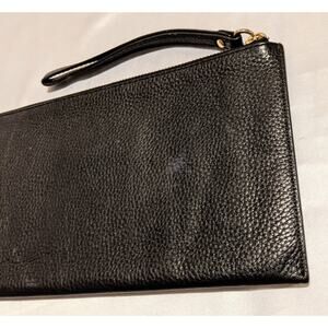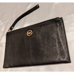 This is a Simple and Classic Michael Kors Fulton Black Pebbled Leather Wristlet Clutch with Gold MK Logo. It measures 10" x 5.5". It has a Black Michael Kors signature lining, multiple card slots, a large 3 1/2" x 7” interior pocket, a zip closure, and a detachable wrist strap. It has a small area of wear on each corner, a tiny white spot, and a few small areas of rubbing on the leather. Otherwise it is in good pre-owned condition. Please see pics for details.