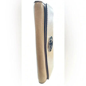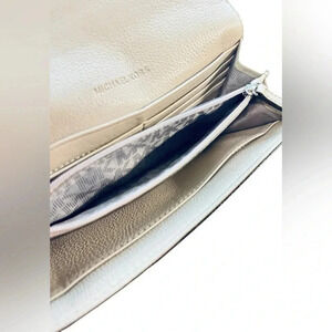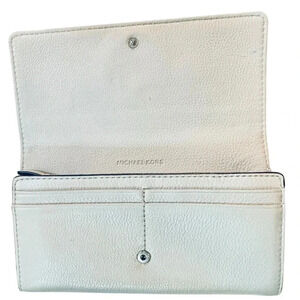 A Michael Kors carryall wallet styled in leather construction with silver-tone hardware. This Michael Kors carryall features a flap front with a logo medallion, a snap button closure, an outside pocket and lined interior with one zip divider, two bill pockets and 14 card slots.
