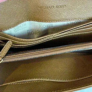 This Fulton design combines the very best of elegance and utility for an accessory that keeps you feeling organized and looking chic. Soft pebbled leather with a MK medallion symbol on front plent of compartments and card slots.