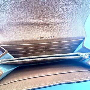 A classic and sophisticated continental wallet from Michael Kors. Crafted from genuine pebbled leather in a beautiful luggage brown, this wallet features a flap closure with the iconic MK padlock hardware. The organized interior has plenty of space for all your cards, cash, and coins.