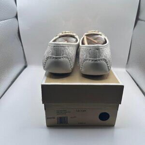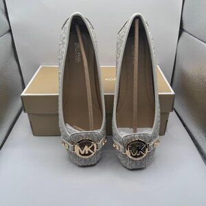The Fulton Moccasin is a round toe flat with a large MK emblem at the toe. The Vanilla signature monogram on this shoe is paired with gold metal accents. This is new with box size 7.5. Medium width and fits true to size.