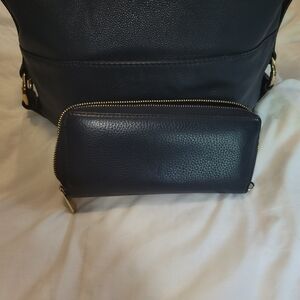 Elegant navy leather bag with matching wallet.