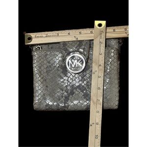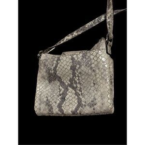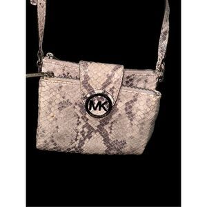 Michael Kors Fulton Pearl Grey snakeskin crossbody Genuine leather outside pocket on back of bag snap closure with two zippered pockets inside of bag has two pockets with 6 credit card slots Adustable strap Silver hardware