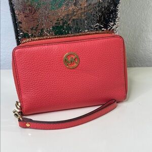 Michael Kors Fulton Pinkish Red Zip Around Leather Phone Case Wristlet Wallet