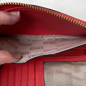 Stylish and practical, this Michael Kors red leather wristlet is perfect for on-the-go convenience. Featuring a sleek design and durable material, it's a must-have accessory.