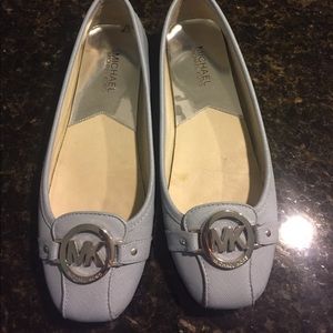 This is a pit of authentic Michael Kors Fulton flats . In great used condition . Minor scuffs on back heels , but not really noticeable when wearing . They are size 8 , the color is a pale baby blue ! Goes with everything . I'm open to offers