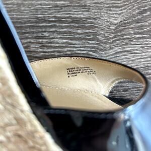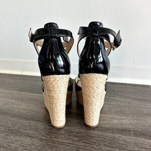Michael Michael Kors Gabriella black patent leather espadrille wedge sandals. Never worn outdoors as shown by pristine soles, but show noticeable imperfections from storage including strap cracking, interior wear & small scuffs on patent finish. Features crisscross straps with gold-tone buckle, jute-wrapped wedge heel, and rubber outsole.