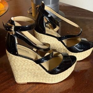Strappy and chic! These Michael Kors Gabriella wedges feature glossy black patent straps with a natural jute wedge heel. A perfect summer-to-night shoe!