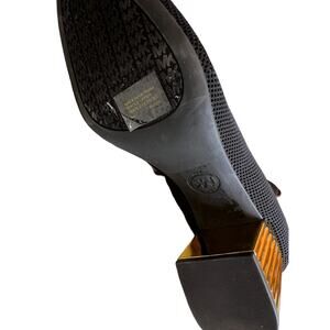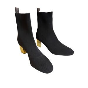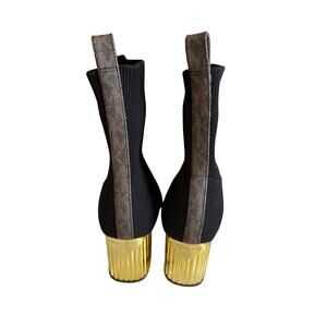 New Michael Kors Galvanized Heel Pull On Stretch Ankle Booties Black, size 8. These pull on sock style stretch booties feature a gold galvanized metal Stacked heel Almond shaped toe and back MK Logo up back of boot