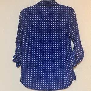 This MK dress shirt is a pretty royal blue color with black/grey/white dot geometric detail makes it a great layering piece or a shirt that you can wear all on it's own. Feel free to wear the sleeves buttoned up to a 3/4 length or full length sleeve. Versatility! Soft material with a single pocket that has a metal detailing to carry through the geometric design while creating some additional texture.