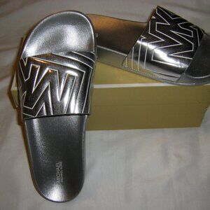 Michael Kors Gilmore Slides Metallic Silver MK Logo Women's Size 10 BOXED