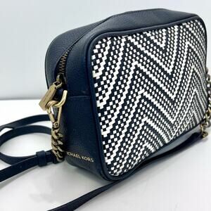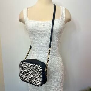 Michael Kors Ginny Camera Crossbody Bag Woven Intrecciato Chevron Leather Navy