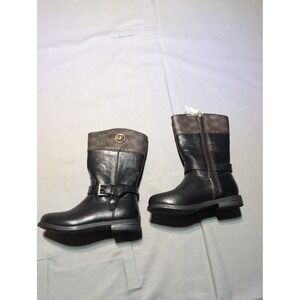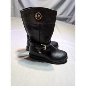Keywords: Michael Kors, girls boots, riding boots, black boots, faux leather boots, buckle boots, MK logo, kids shoes, size 9, zip up boots, gold hardware, childrens footwear, dress boots, casual boots