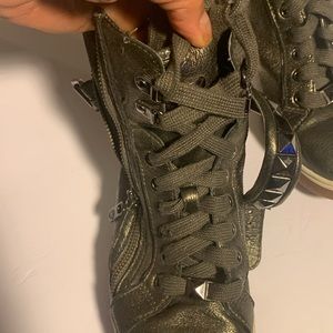 MK Gunmetal crackle studded Hightop sneaker. Lace up and side sipper closure. Adjustable buckle studded strap. Size 9. EUC