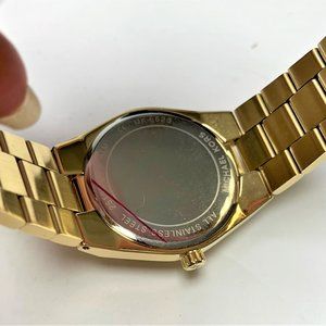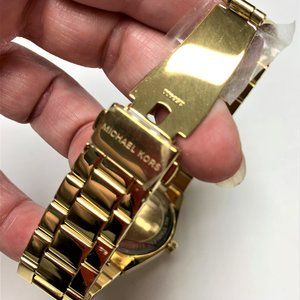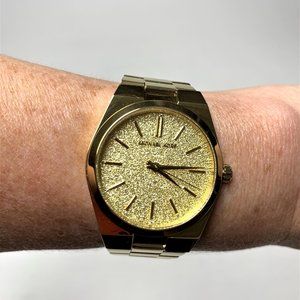 Magnificent analogue ladies wristwatch that has been manufactured and designed by Michael Kors. This 36mm Channing watch features a textured glitter gold-tone dial with gold-tone stick indexes, three-hand movement and gold-tone stainless steel bracelet. Comes with box as well as extra links and original tag. Still has protective covering over clasp and on back case. Excellent Condition.