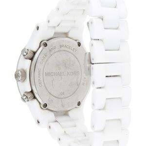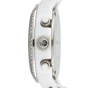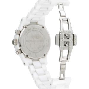 Stainless steel and ceramic 35mm Michael Kors Glitz Runway watch featuring a quartz movement with chronograph and 24-hour complications, crystal bezel, white dial and link bracelet with butterfly clasp.