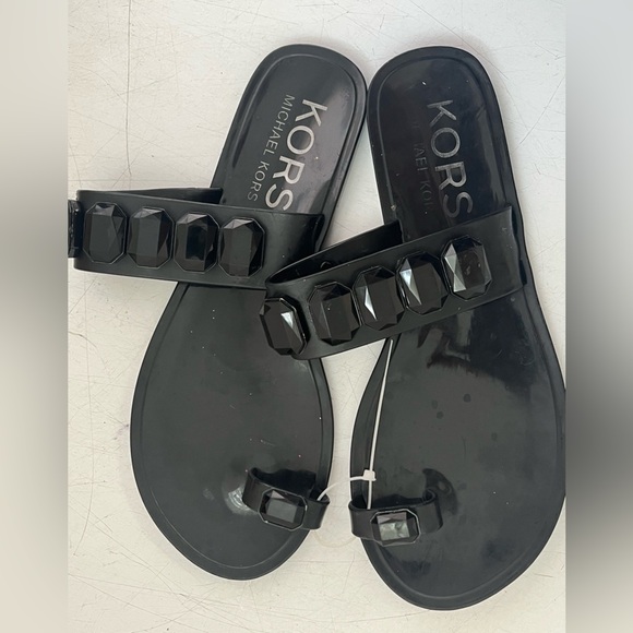 Elegant black sandals with glossy finish. Features bold gem accents. Ideal for chic casual looks. Preowned size 7