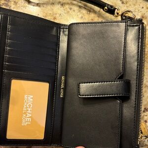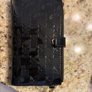 Glossy black wallet by Michael Kors. Embossed MK pattern. Gold logo detail.
