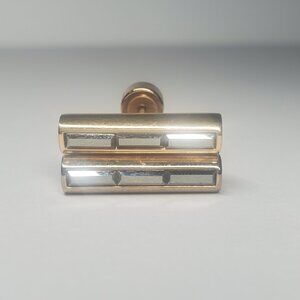 A pair of Michael Kors Gold tone barrel earrings with black stones. These are stainless steel and gold plated post earrings for pierced ears. Good used condition, has some surface wear and a few small scratches.