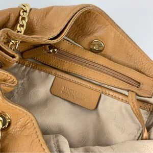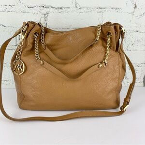 Michael Kors Gold Chain Jet Set Drawstring Tan Brown Leather Satchel Purse