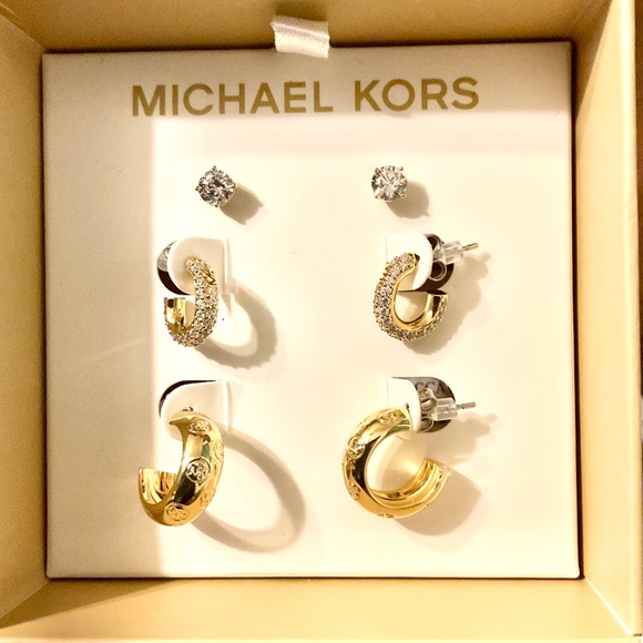Michael Kors. Features gold hoops,pave hoops, both pairs have MK logo & cubic zirconia studs. These are perfect for stacking or alone. ❤️These are gift ready. This is a rare & sold out set. I don’t see this set for sale elsewhere. 💋