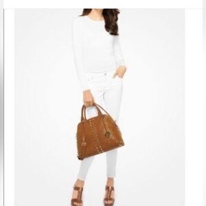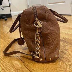 Exterior: Gold-tone hardware, stud detail trims front center seam and bottom corners, hanging MK logo circle charm