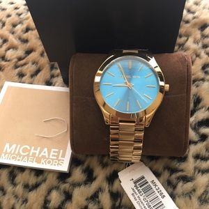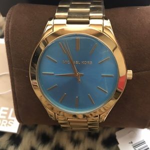Brand New w/tags Michael Kors watch. Gold watch with a baby blue face! No scratches or marks on band or face of Watch. Plastic is still on face and band of Watch. Original purchase tags and MK book attached and included.