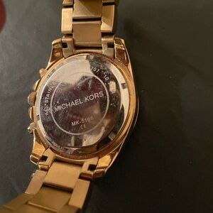 Michael Kors Stainless Steel gold plated watch is detailed with chronograph dials and pavé stones around the bezel. It is in excellent condition and is a beautiful timepiece. New battery just replaced for $30, please see video. Fits a small wrist, no extra links though which is price was lowered. Make me an offer.😀